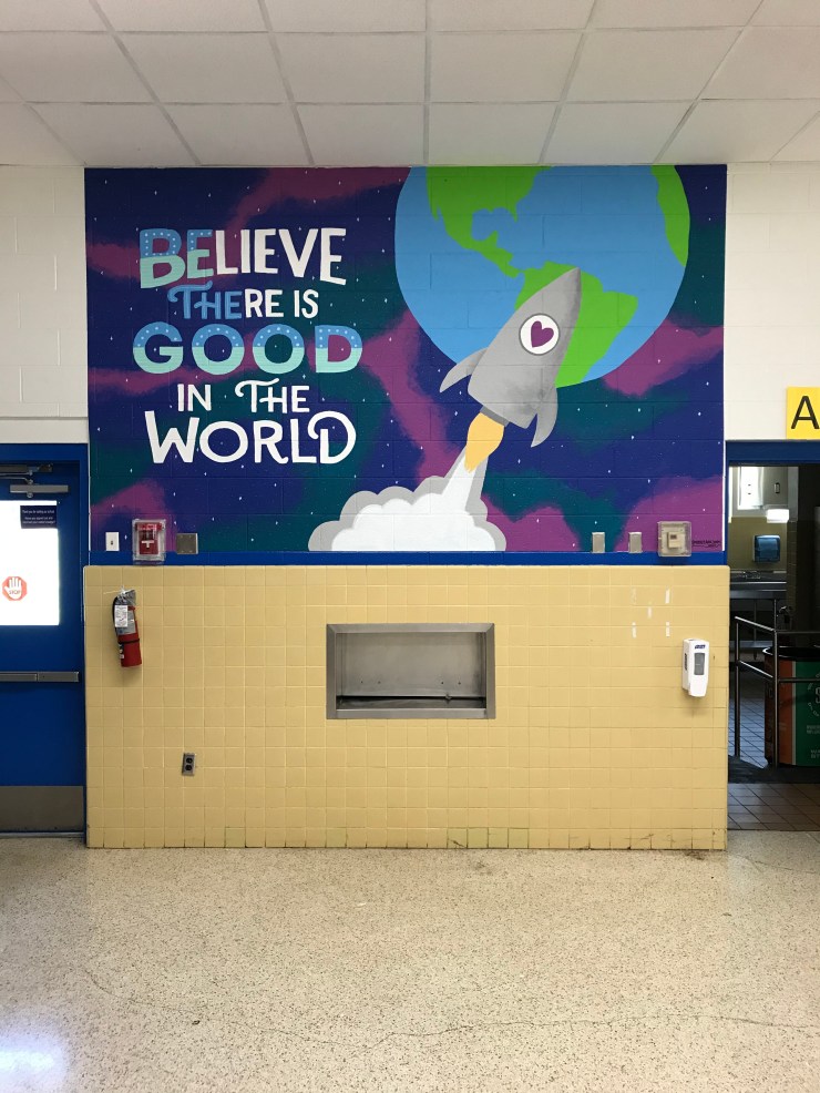 I had the please of working with Arrowhead Elementary in Virginia Beach to create two murals to inspire curiosity and kindness in their students and staff the above mural lives in their foyer in an area that teachers and students can use for exploration and STEM related activities. The below pictured kindness mural lives in their back hall across from their computer lab and serves as a reminder to above all else be kind.